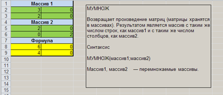 Формула МУМНОЖ знаходить добуток двох масивів. У цьому випадку виділити осередок А8, викликати майстер функцій, знайти формулу МУМНОЖ і мишею вказати спершу перший масив чисел, перевести курсор у друге поле майстра функцій і вказати другий масив чисел. В осередку А8 з'явиться результат. Повторити процедуру розтягування функцій зазначену в пункті 1 роботи.